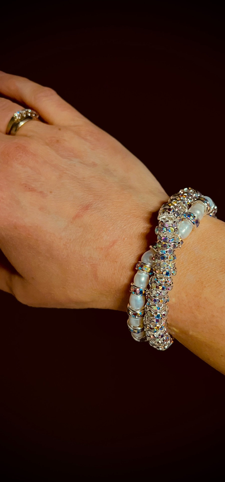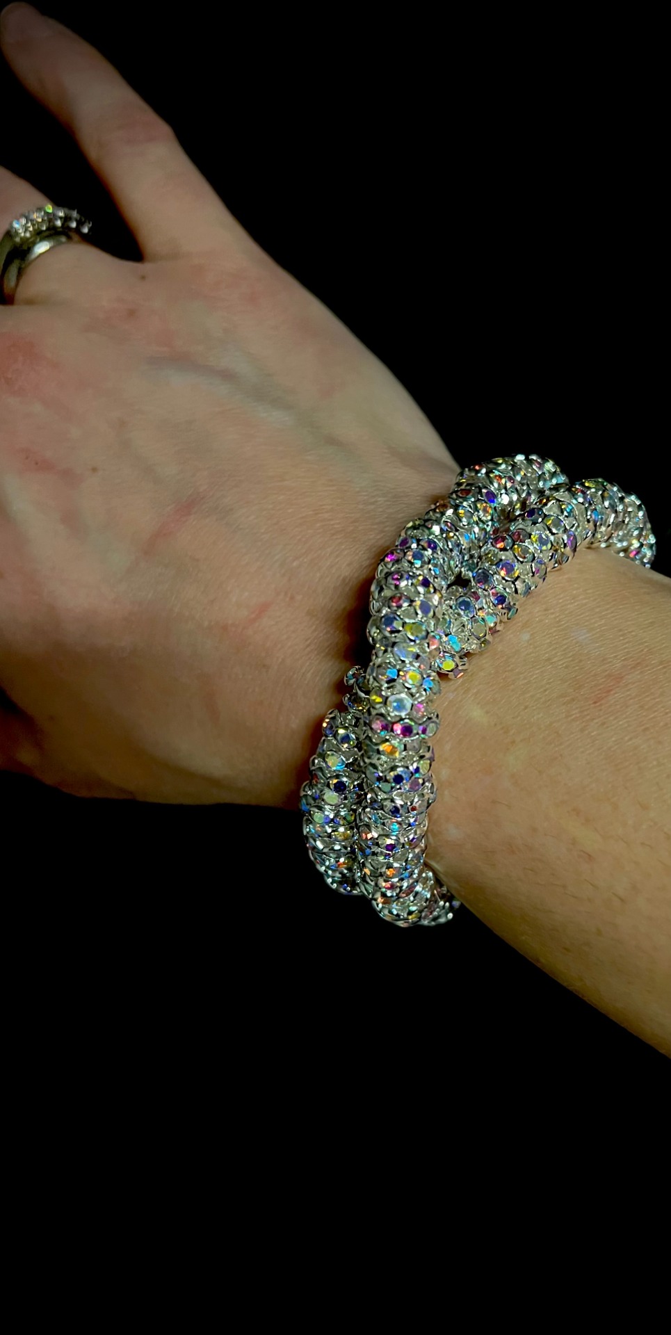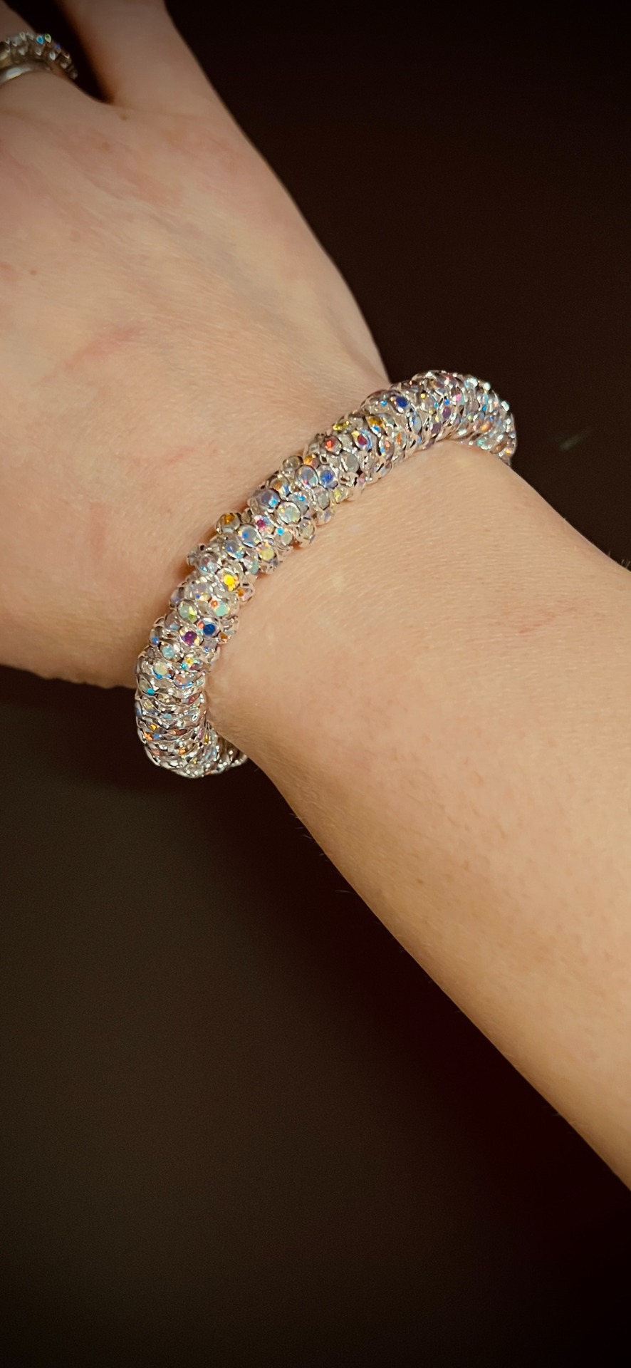 Buede rondeller i sølvfarge med klare smykkestener i fargespill.