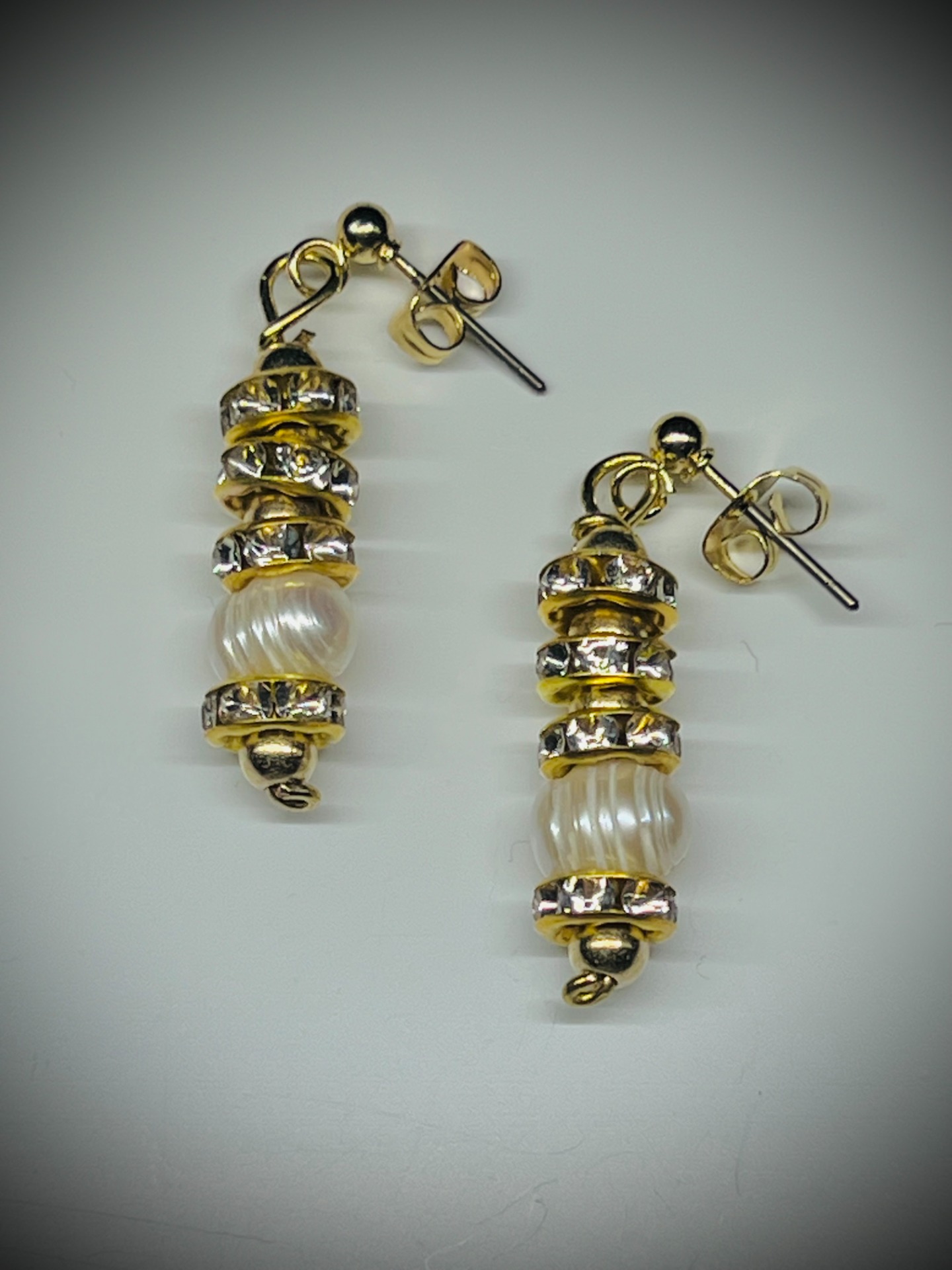 Gullfargede rondeller med klare smykkestener, gullfarget romerperler og hvite ferskvannsperler. Gullbelagte ørestikk.