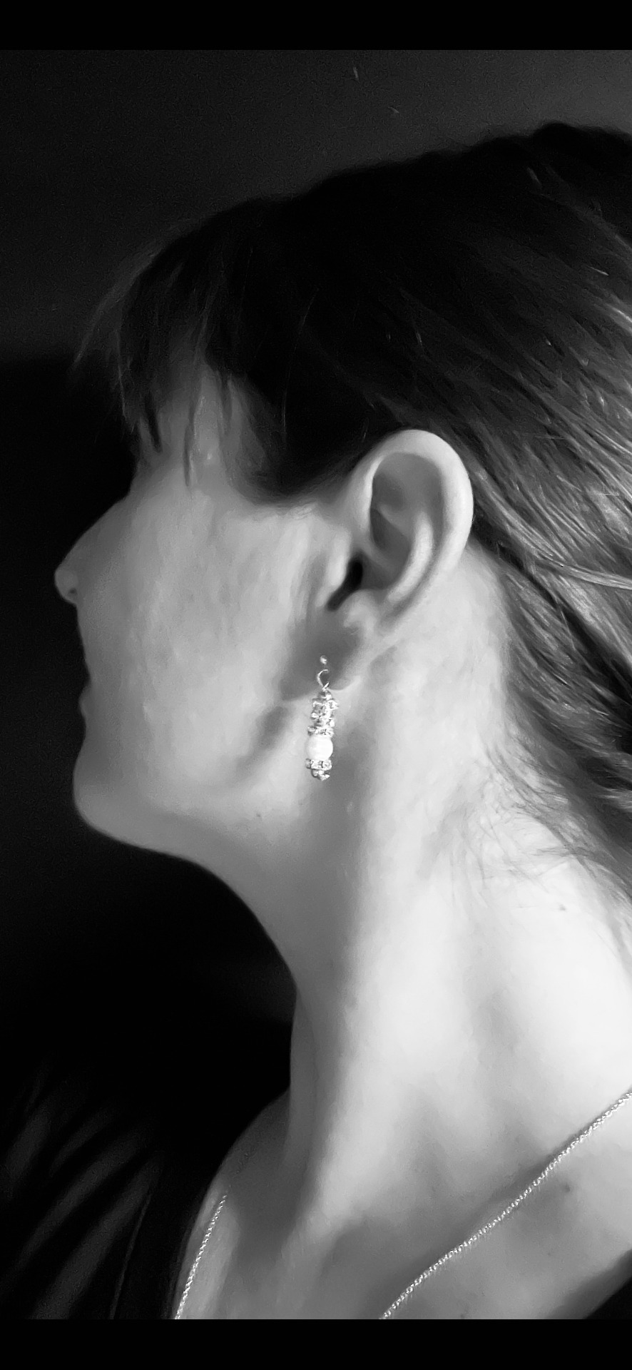 Sølvfargede rette rondeller med klare smykkestener, sølvfarget romerperler og hvite ferskvannsperler. Sølvbelagt ørestikk.