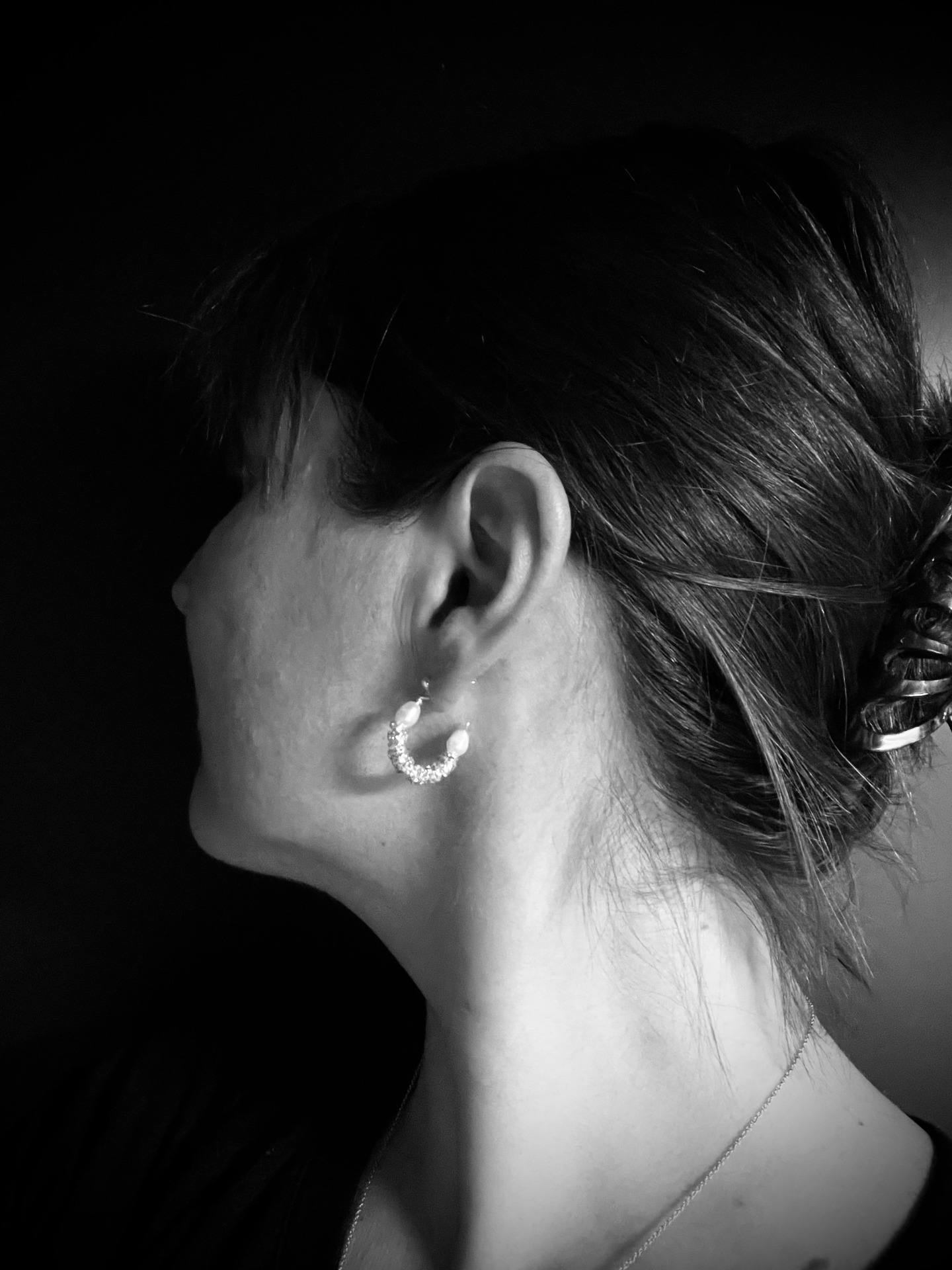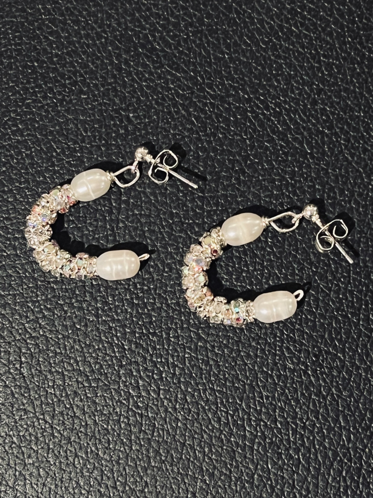Rondeller i sølvfarge med klare krystaller med fargespill og hvite ferskvannsperler.